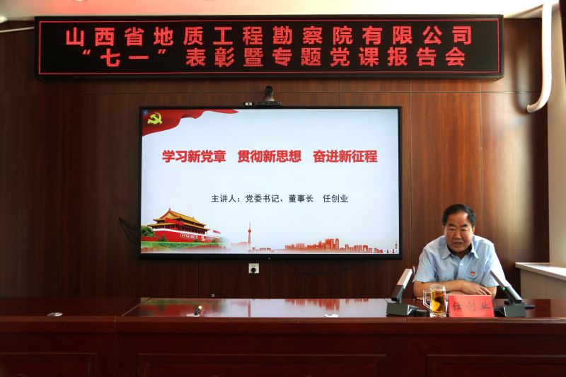 表彰结束后,任创业以《学习新党章 贯彻新思想 奋进新征程》为题讲了专题党课,结合主题教育安排部署,围绕党章的建设历程、二十大党章修改的主要内容、准确把握学习贯彻新党章的实践要求三个方面,教育引导全体党员坚定理想信念、践行初心使命、发挥模范作用、发扬斗争精神,全力推动地质事业高质量发展。