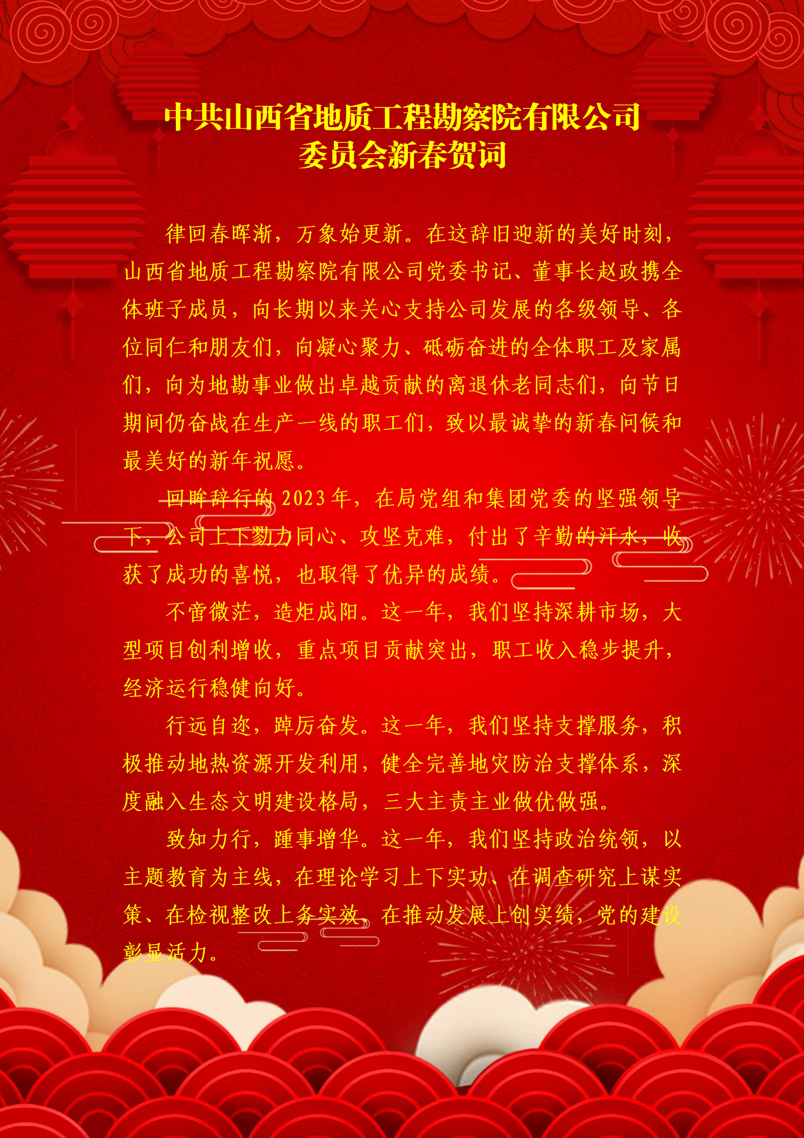 【概要描述】 律回春晖渐,万象始更新。在这辞旧迎新的美好时刻球速体育app官网党委书记、董事长赵政携全体班子成员,向长期以来关心支持公司发展的各级领导、各位同仁和朋友们,向凝心聚力、砥砺奋进的全体职工及家属们,向为地勘事业做出卓越贡献的离退休老同志们,向节日期间仍奋战在生产一线的职工们,致以最诚挚的新春问候和最美好的新年祝愿。