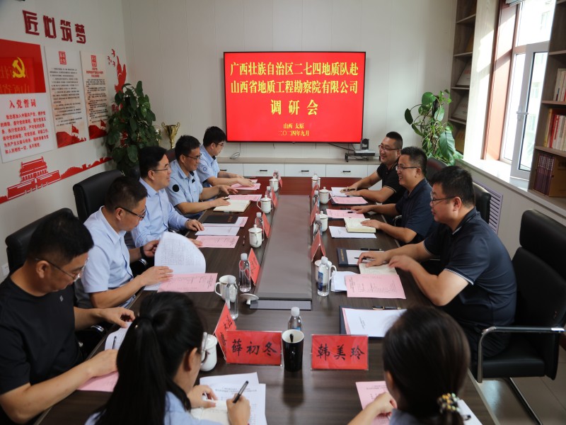 9月26日,广西壮族自治区二七四地质队队长徐海棚、副队长刘华尧、总工办副主任郭正一到球速体育app官网调研交流。公司党委书记、董事长赵政主持调研交流会,公司相关领导班子成员及部门负责人参加调研。