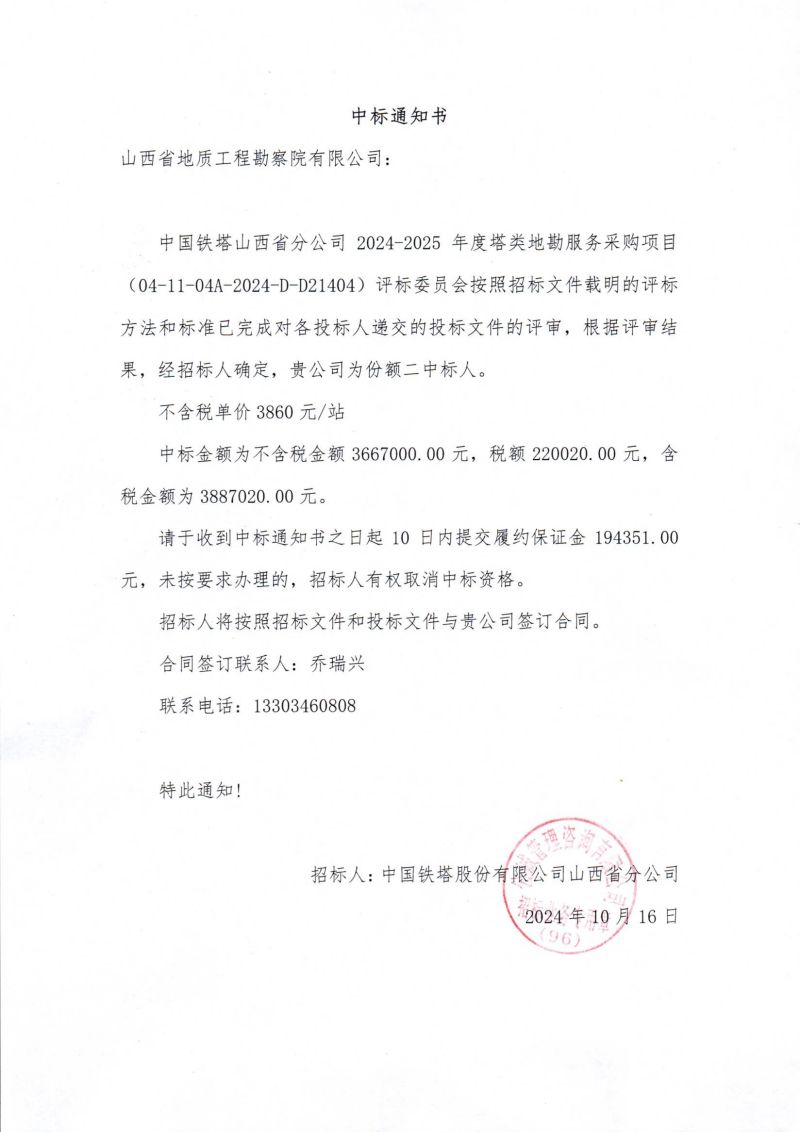 近日,我公司下属地质科技二公司成功中标中国铁塔山西省分公司2024-2025年度塔类地勘服务采购项目,中标金额为388.702万元。